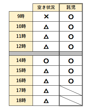 △⇒施術内容によってはご予約可能 ×⇒ご予約不可