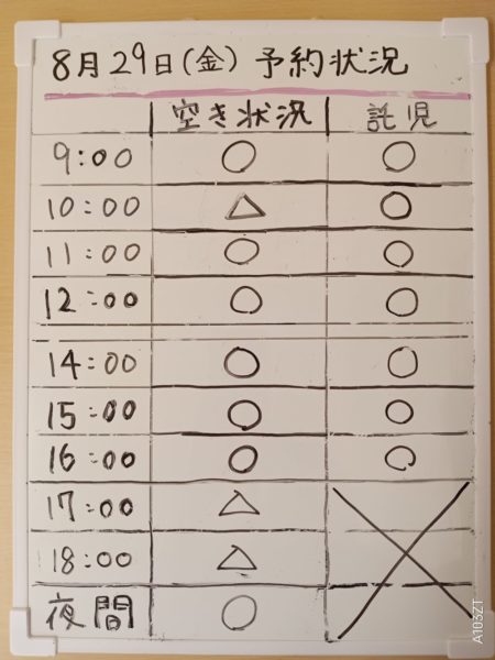 2025年08月28日(木)予約状況8月29日(金)ご予約状況|那珂川市ヒヨコ堂なかばる整骨院