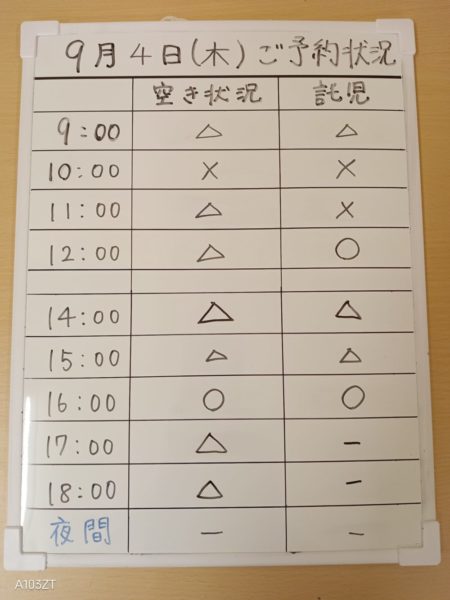 2025年09月04日(木)予約状況令和7年9月4日(木)ご予約状況|那珂川市ヒヨコ堂なかばる整骨院