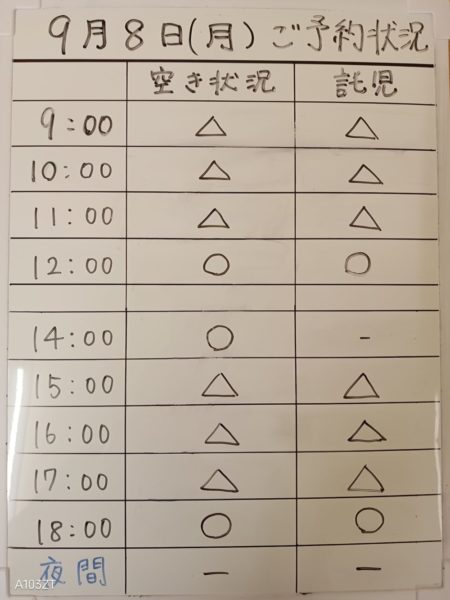 令和7年9月8日(月)のご予約状況をお知らせいたします。