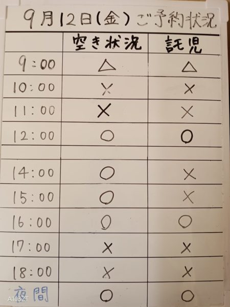 令和7年9月12日(金)のご予約状況をお知らせいたします。