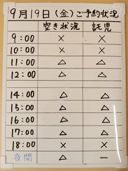 令和7年9月19日(金)のご予約状況をお知らせいたします。
