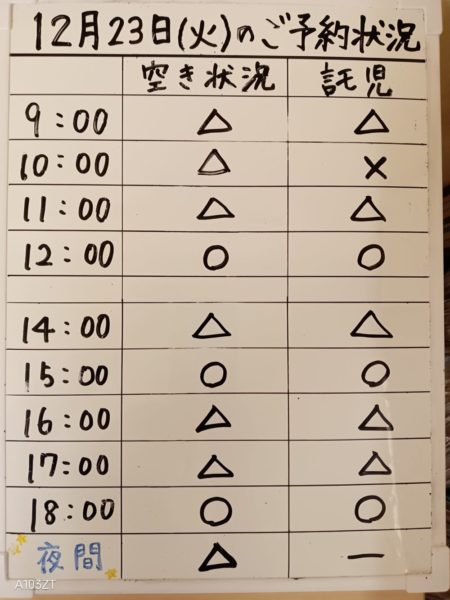 令和7年12月23日(火)のご予約状況をお知らせいたします。