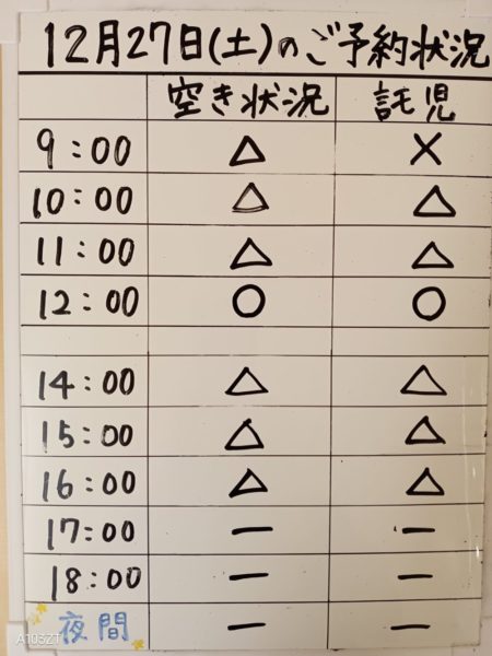 令和7年12月27日(土)のご予約状況をお知らせいたします。