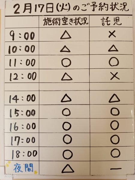 令和8年2月17日(火)のご予約状況をお知らせいたします。
