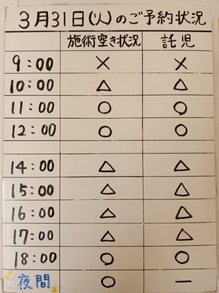 2026年03月30日(月)予約状況令和8年3月31日(火)のご予約状況|那珂川市ヒヨコ堂なかばる整骨院