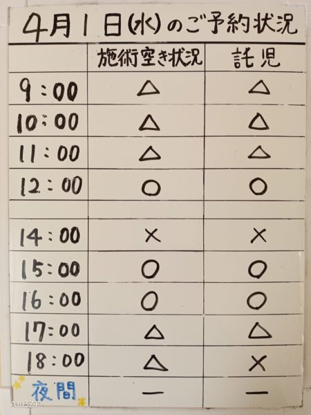 2026年03月31日(火)予約状況令和8年4月1日(水)のご予約状況|那珂川市ヒヨコ堂なかばる整骨院