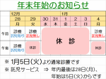 【年末年始休診日のお知らせ】 ●28日(月) ⇒ 通常診療。 ※託児サービス年内最終日です。ご希望の方はお早めにご予約ください。 ●29日(火) ⇒ 午前のみ診療・託児お休み ●30日(水)~1月3日 ⇒ 休診 ●4日㈪ … 続きを読む 【年末年始休診日のお知らせ】