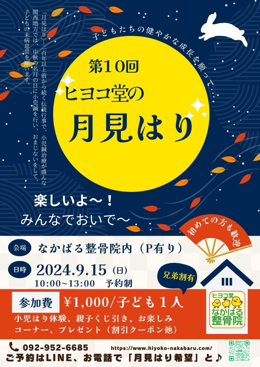第10回こどもはりの日【月見はり】のお知らせです。 ◆日時 2024年9月15日(日) 10〜13時(予定)→15時まで延長しました! ※要予約 ◆場所 なかばる整骨院内 ◆対象 赤ちゃん〜小学生 ◆参加 … 続きを読む こどもはりの日【月見はり】のお知らせ