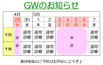 【GW休診日のお知らせ】 ●休診日 4月29日(火)・5月3日(土)・5月4日(日)・5月5日(月)・5月6日(火) ●4月30日(水)・5月1日(木)・5月2日(金)は通常通り診療しております。 連休前後は早めにご予約 … 続きを読む 【GW休診日のお知らせ】
